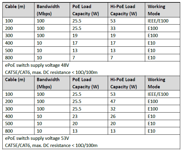 Maximal erreichbare Entfernungen des ePoE in Abhängigkeit zu CAT-Kabel, Kameraleistung und ePoE Spannung.