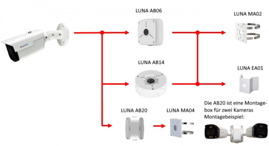 Die LUNA KA2503 ist eine HD-Bullet-Kamera mit IR-Strahler (max. 80 m) für den Innen- und Außeneinsatz (IP67). Der 1/2,7" CMOS Sensor liefert bei HD-CVI eine max. Auflösung von 4 Megapixel (2560 x 1440 px) mit bis zu 25 Bildern pro Sekunde. Die Kamera ist mit einem 2,7-13,5 mm Motorzoom-Objektiv ausgestattet und verfügt über WDR und einen mechanischen IR Cut Filter (ICR). Über einen DIP-Schalter am Kabel kann das HD-CVI Signal auch auf TVI, AHD oder CVBS umgeschaltet werden. Weitere Einstellungen an der Kamera können im OSD-Menü vorgenommen werden. Für die Bedienung des OSD Menüs und die Aufnahme der Videos wird ein Rekorder benötigt. Wahlweise kann die Kamera mit einer Spannung von 12 V DC oder 24 V AC betrieben werden.