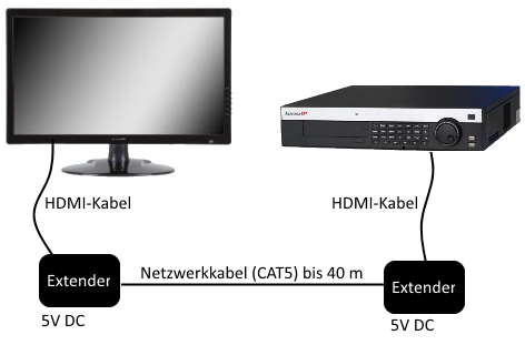 Der HDMI-Extender ermöglicht den Anschluss eines abgesetzten HDMI-Monitors an einen Rekorder oder Videoserver. Dabei kann eine Entfernung von bis zu 40 m überbrückt werden. Die FullHD Übertragung erfolgt über ein handelsübliches Netzwerkkabel (CAT5).