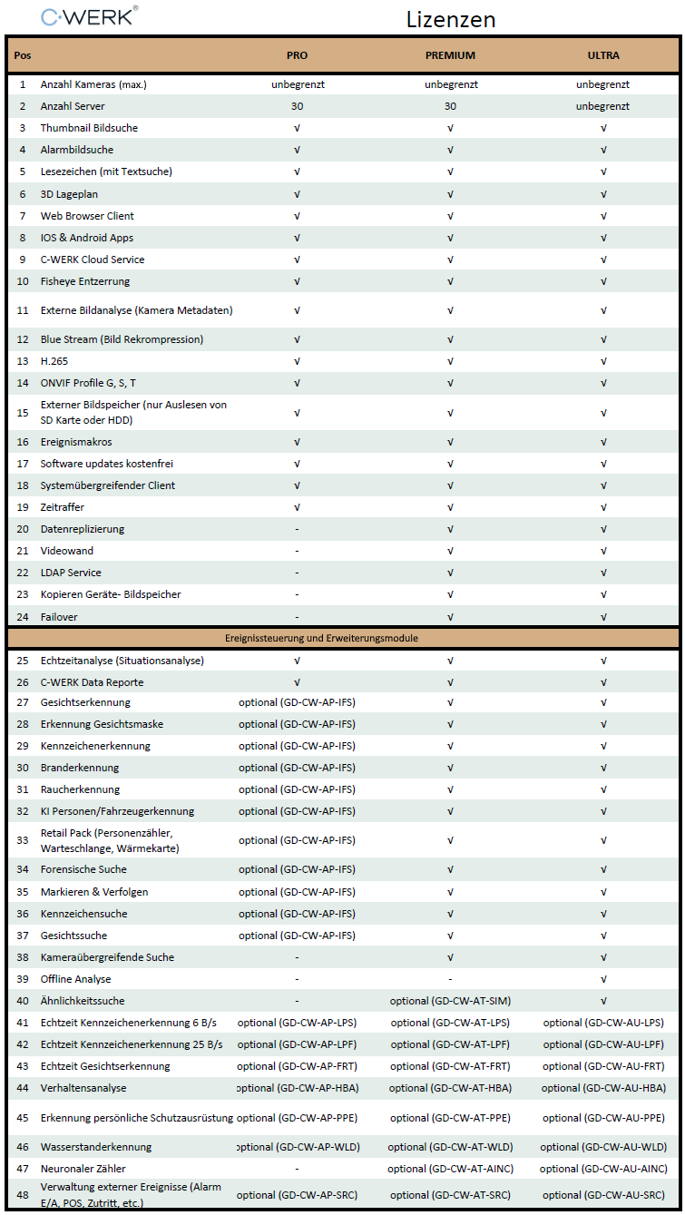 Die C-Werk Management-Software (Premium) ist lauffähig ab der ersten Kameralizenz. Die Lizenz GD-CW-AT-CAM dient zur Erweiterung um je eine Kamera für die Premium-Version der C-Werk Management-Software. Diese Variante von C-Werk unterstützt alle Programm-Features, wenige davon sind optional. Die Forensische Suche ist in dieser Version bereits enthalten.