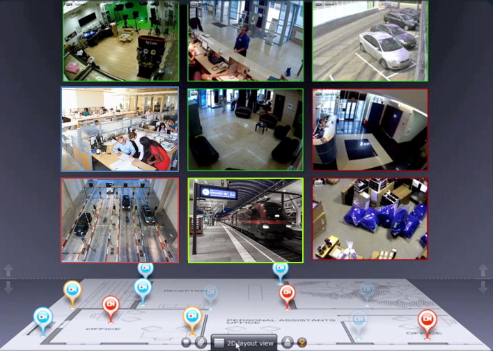 interaktive 3-D-Karte zeigt die Kamerapositionen auf einer Sitemap an. Die Karte kann ein- oder ausgeblendet werden. Der Benutzer kann sofort sehen, wo sich eine ausgewählte Kamera auf der Karte befindet, um ihren Standort zu identifizieren. Die Entzerrung der Bilder (Fisheye-Entzerrung) wird auf der Grafikkarte des Computers errechnet. Dies spart zusätzliche CPU-Last. Die Live-Bilder werden automatisch in Standardformaten auf dem Bildschirm angezeigt. Der Viewer unterstützt sowohl Standard-Fisheye-Objektive als auch Immer-Vision-Panamorph-Objektive.