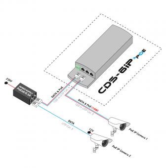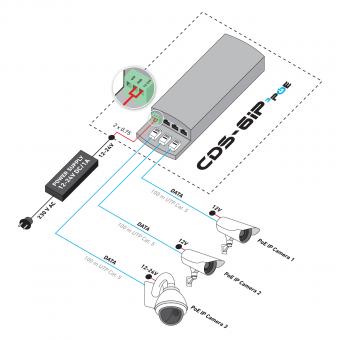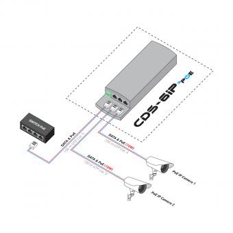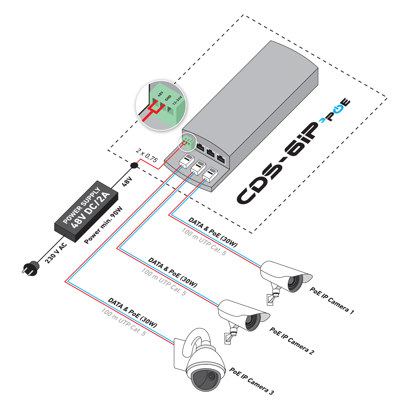 Die Stromversorgung des CDS-6IP 3PoE erfolgt über 48 VDC (Netzteil nicht im Lieferumfang). Bei Verwendung des mitgelieferten PoE-Netzteils können Geräte mit einer Gesamtleistung von bis zu 15W versorgt werden. Wird keine PoE-Versorgung der angeschlossenen Kameras benötigt. Kann die Versorgung auch über Passive PoE 48 VDC, mit 12-24 VDC oder Standard PoE erfolgen.