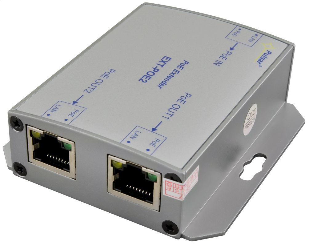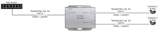 Der PoE-Extender EXT-POE2 verlängert die Reichweite einer PoE-Verbindung um zusätzliche 100 Meter. Die Ausgänge sind konform zum PoE-Standard IEEE 802.3af und versorgt Endgeräte mit bis zu 15,4W. Der Extender verfügt sowohl über eine Überlastungs- als auch eine Kurzschlusssicherung. Der EXT-POE2 benötigt kein externes Netzteil, die Stromaufnahme erfolgt direkt über den PoE-Eingang.