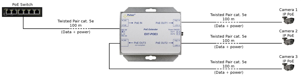 Der PoE-Extender EXT-POE3 verlängert die Reichweite einer PoE-Verbindung um zusätzliche 100 Meter. Zwei Ausgänge (OUT1 + OUT2) sind konform zum PoE-Standard IEEE 802.3af und der dritte Anschluss (OUT3) ist ein passiver PoE Ausgang der nicht der Ethernet-Norm entspricht. Der EXT-POE3 benötigt kein externes Netzteil, die Stromaufnahme erfolgt direkt über den PoE-Eingang.