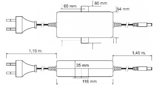 116 x 54 (80) x 35 mm / Kabellänge DC 1,15 m / AC 1,45 m