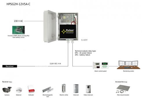 Das gepufferte Netzteil HPSG2H-12V5A-C wird als unterbrechungsfreie Stromversorgung im Außenbereich mit stabilisierten Spannungsanforderungen 12V DC (+/-15%) eingesetzt. Das Netzteil liefert eine Ausgangsspannung von 13,8V DC mit einer Leistung von 4A +1A Akkuladestrom. Beim Ausfall der Netzspannung wird unterbrechungsfrei auf die Akku-Spannung umgeschaltet.