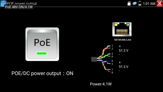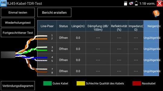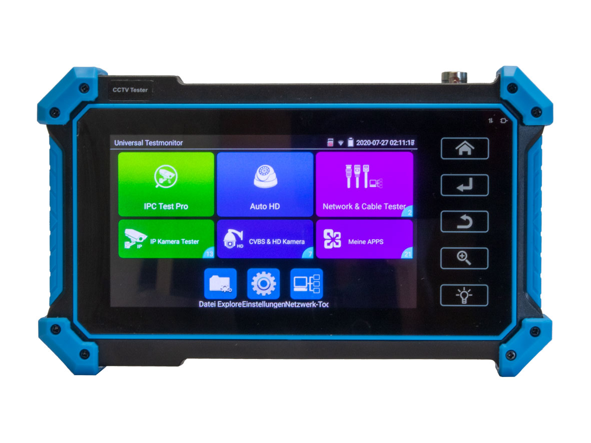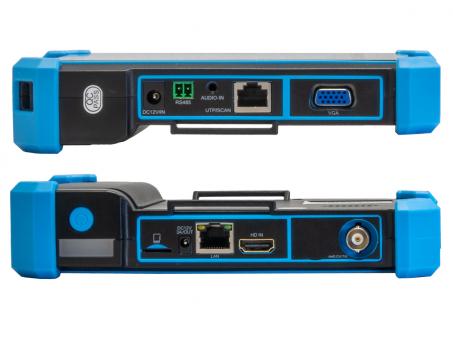 - RS485, VGA in, HDMI in, PoE/LAN-Port, UTP-Kabeltester-Port, Audio in, Video in (BNC), microSD, WiFi