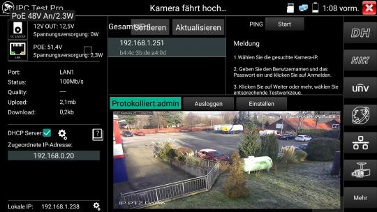 - u.a. Video- Aufzeichnung, -Screenshot und Wiedergabe, IP-Kamera -Suche und -Konfiguration, HD-CVI OSD Bedienung, PTZ-Steuerung, Schneller Onvif-Test, Testprogramme für Kameras von Luna, Grundig usw., Netzwerktools, Bildwiedergabe von WLAN-Kameras