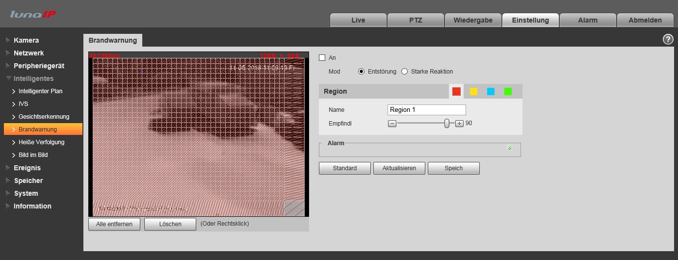 | Mit den Smart-Detect-Funktionen (IVS) bietet LUNA eine umfassende Objekterkennung. Die Falsch- sowie Fehlalarmquote ist wesentlich geringer als bei der üblichen Bewegungserkennung, die auf einem einfachen Pixelvergleich basiert. Die daraus resultierenden Möglichkeiten bringen bisherige Videosicherheitsanwendungen auf ein neues Level. Gleichzeitig werden völlig neue Anwendungen auch außerhalb der Videoüberwachung erschlossen. Verfügbare IVS-Funktionen der Kamera sind unter Anderem: Brandwarnung, Stolperdraht, Eindringen sowie fehlendes/hinzugefügtes Objekt. | ![]() |