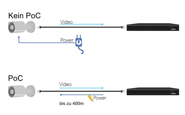 Power over Coax (PoC) übertragt sowohl das Videosignal, Steuerdaten (PTZ) und zusätzlich die Versorgungsspannung für die Kameras. Es wird nur noch ein Kabel benötigt. Lange Zeit hat die IP-Technologie mit PoE, Power over Ethernet, einen klaren Wettbewerbsvorteil. Doch durch PoC hat die "klassische" Koaxialtechnik aufgeholt: denn mit PoC sind Übertragungsstrecken bis zu 400m möglich, bei PoE ist bei 100m schon Schluss.
